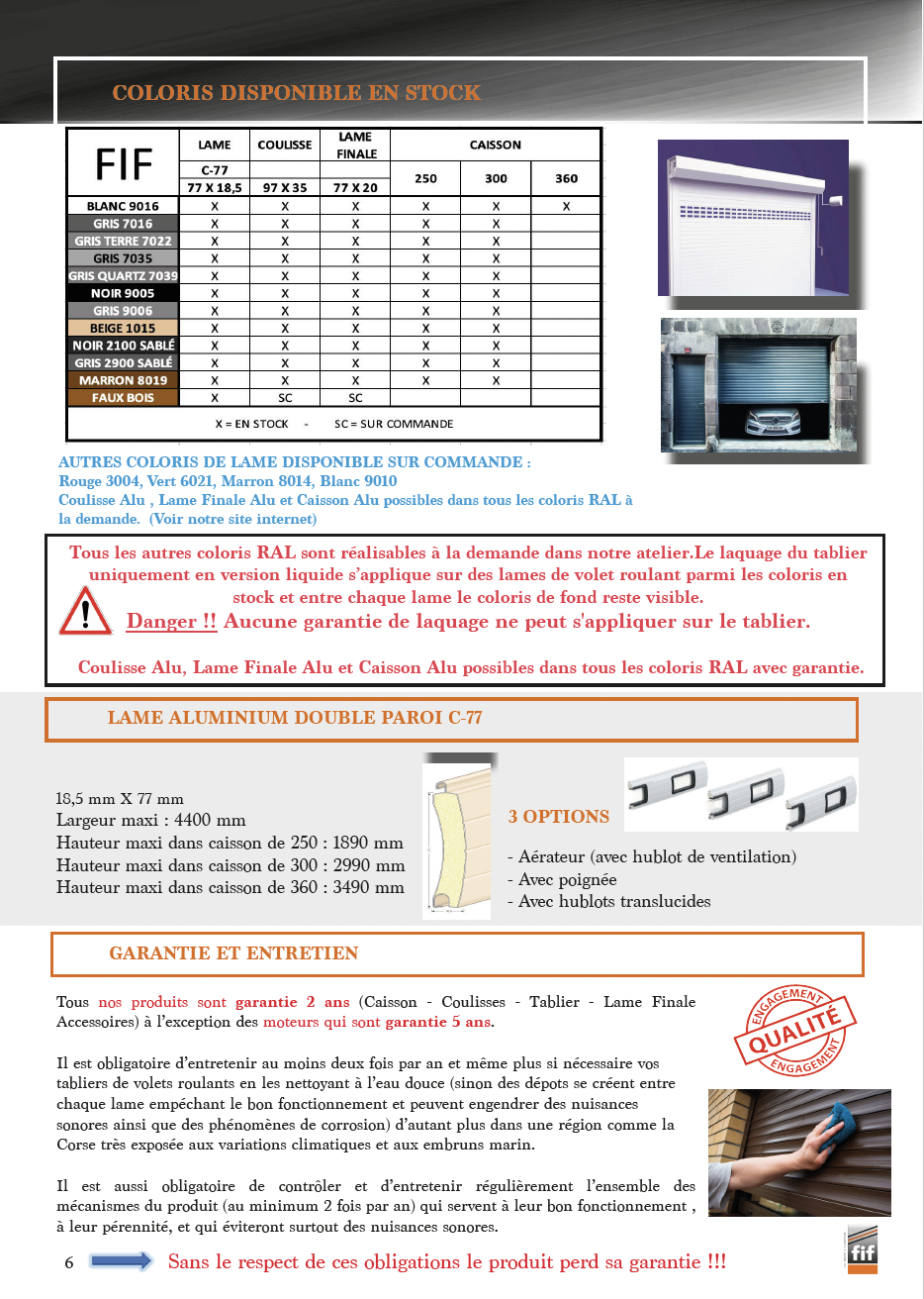 Tous nos produits sont garantie 2 ans (Tablier - Coulisses - Lame Finale - Accessoires) à l’exception des moteurs qui sont garantie 5 ans.