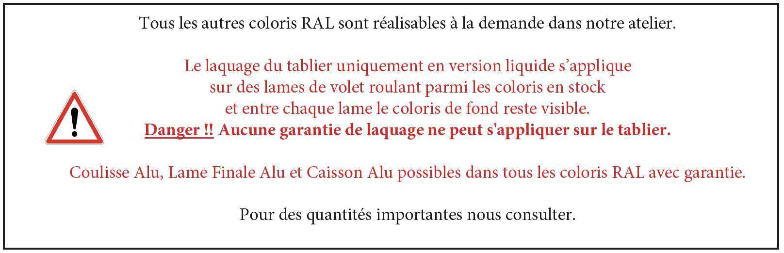 Pour des raisons de garantie, IL EST PLUS QUE FORTEMENT RECOMMANDÉ de choisir un coloris de lames dans la gamme de coloris existante. (Pour rappel le laquage à la demande en version liquide uniquement ne bénéficie d'aucune garantie)